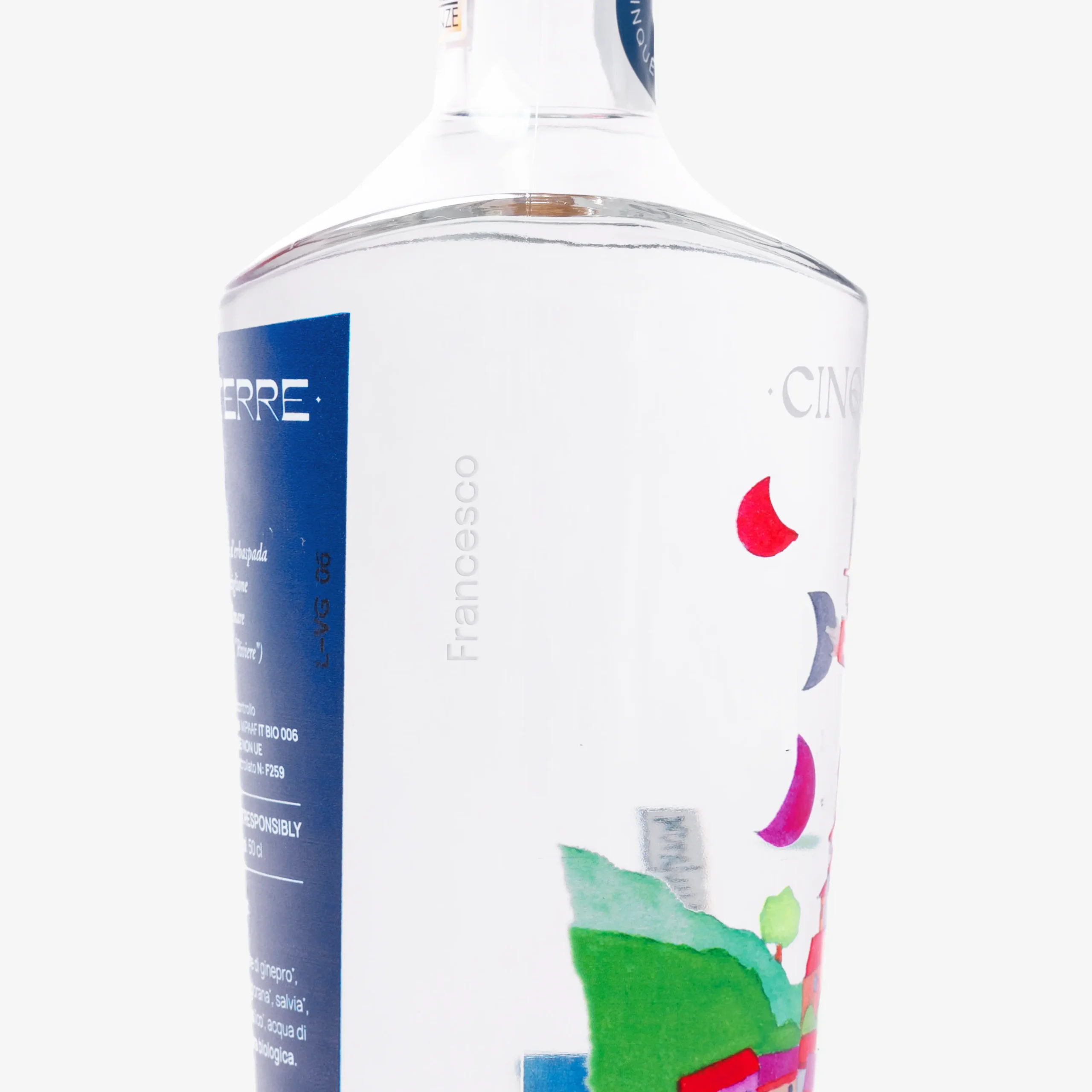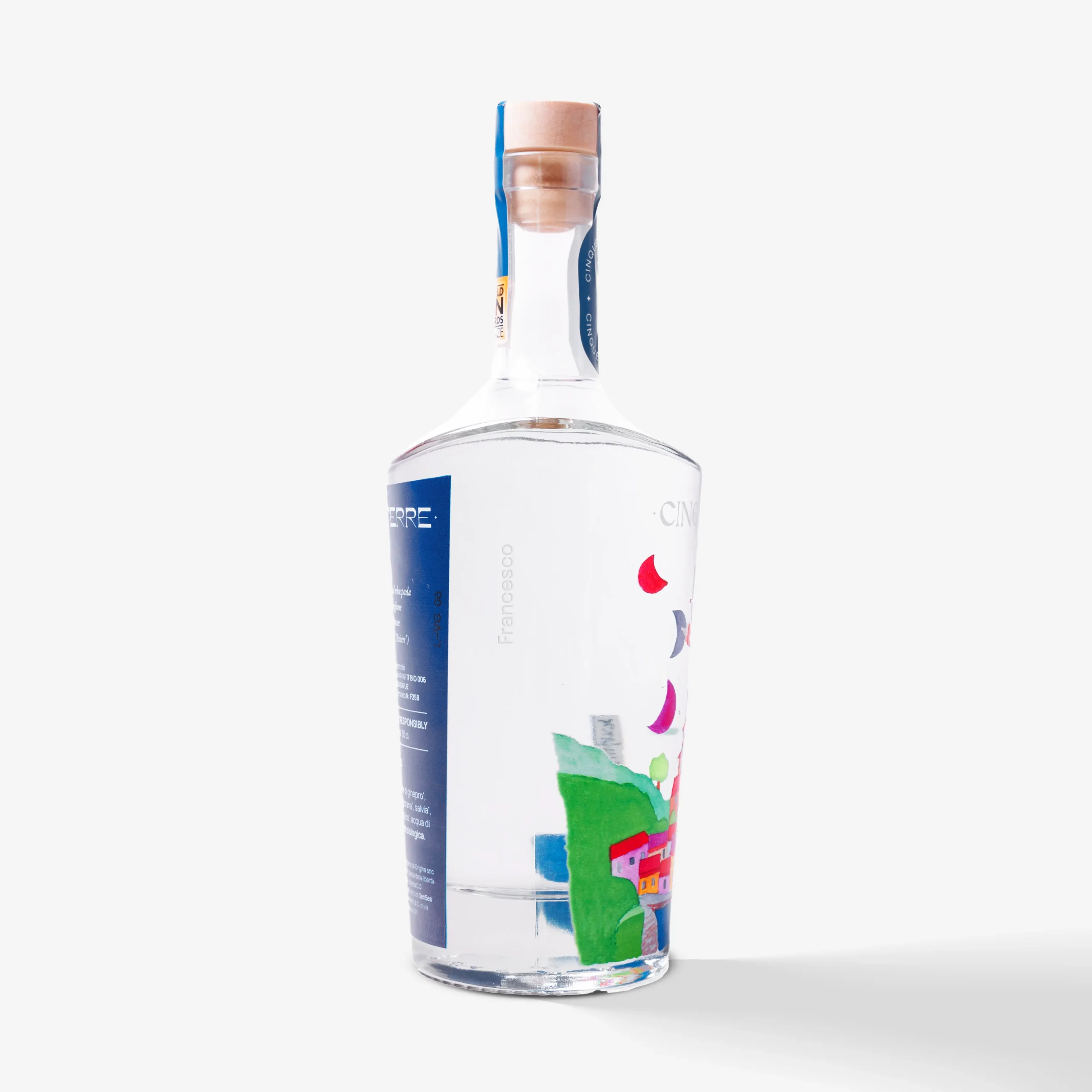 Distillato di grano da frumento tenero aromatizzato, affinato in acciaio inox. Con ginepro ed estratti naturali di: maggiorana, salvia, limone, rosmarino, basilico, acqua di fonte.